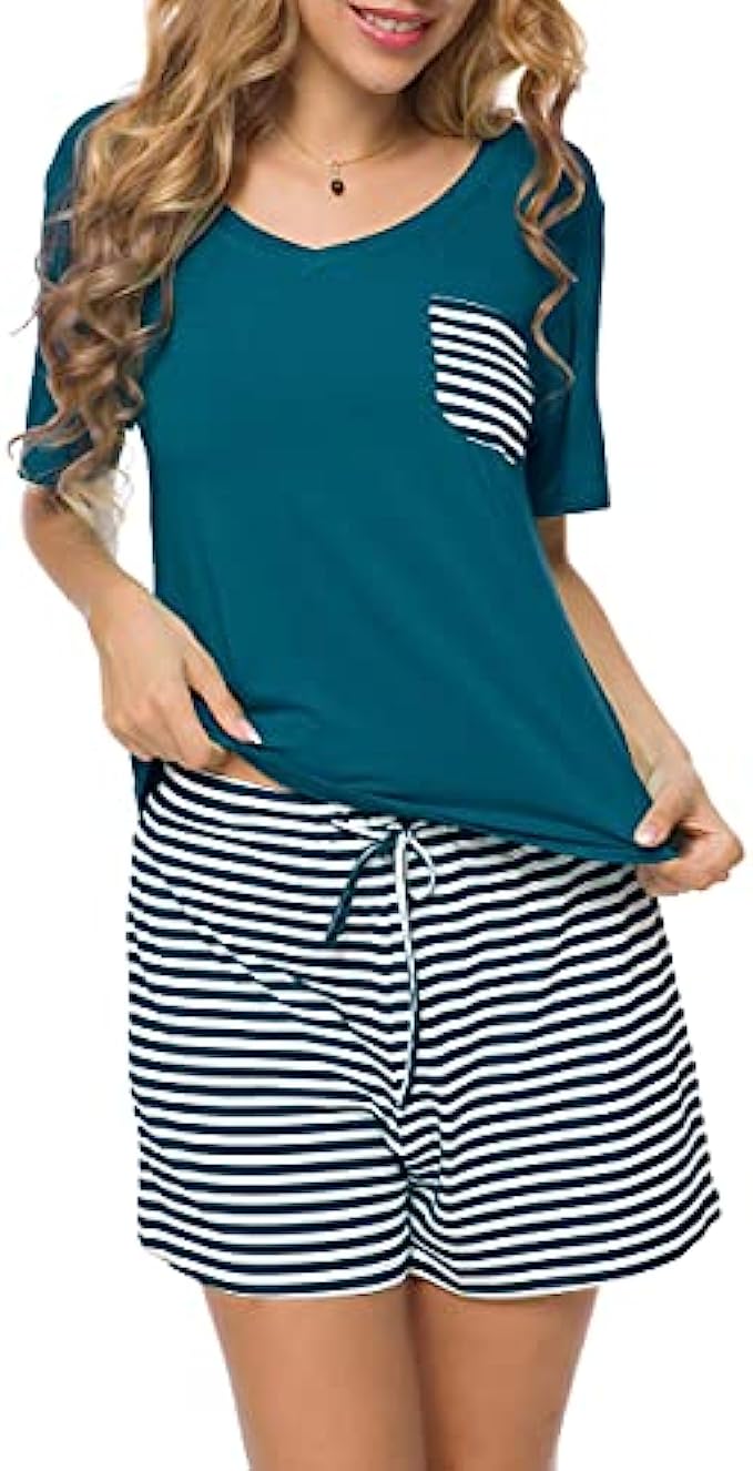 95%Viscose/5%Spandex Imported Pull On closure Hand Wash Only Soft material: The face fabric is stretchy, soft, lightweight, breathable and comfortable to wear as sleepwear/loungewear at home in hot days. 2 Elegant and simple styles to choose: 1, Beige trim decor around the neck and the bottom of shorts, solid colors; 2, Solid colored shirt top with real pocket decoration, classic stripes patterned shorts bottom ELASTIC WAISTBAND: The stretchy elastic waistband ensures that your shorts will remain securely, but comfortably, on your hips throughout the day.